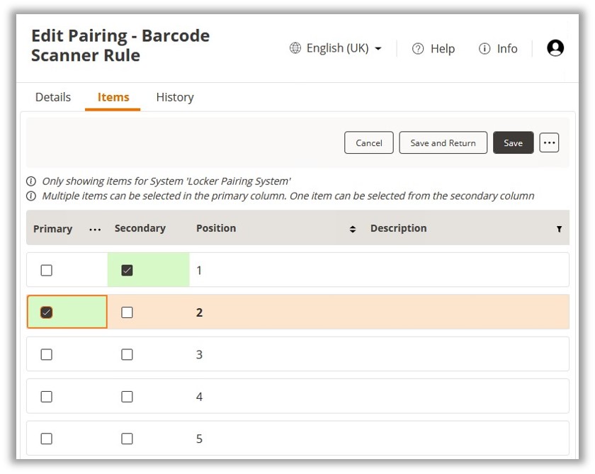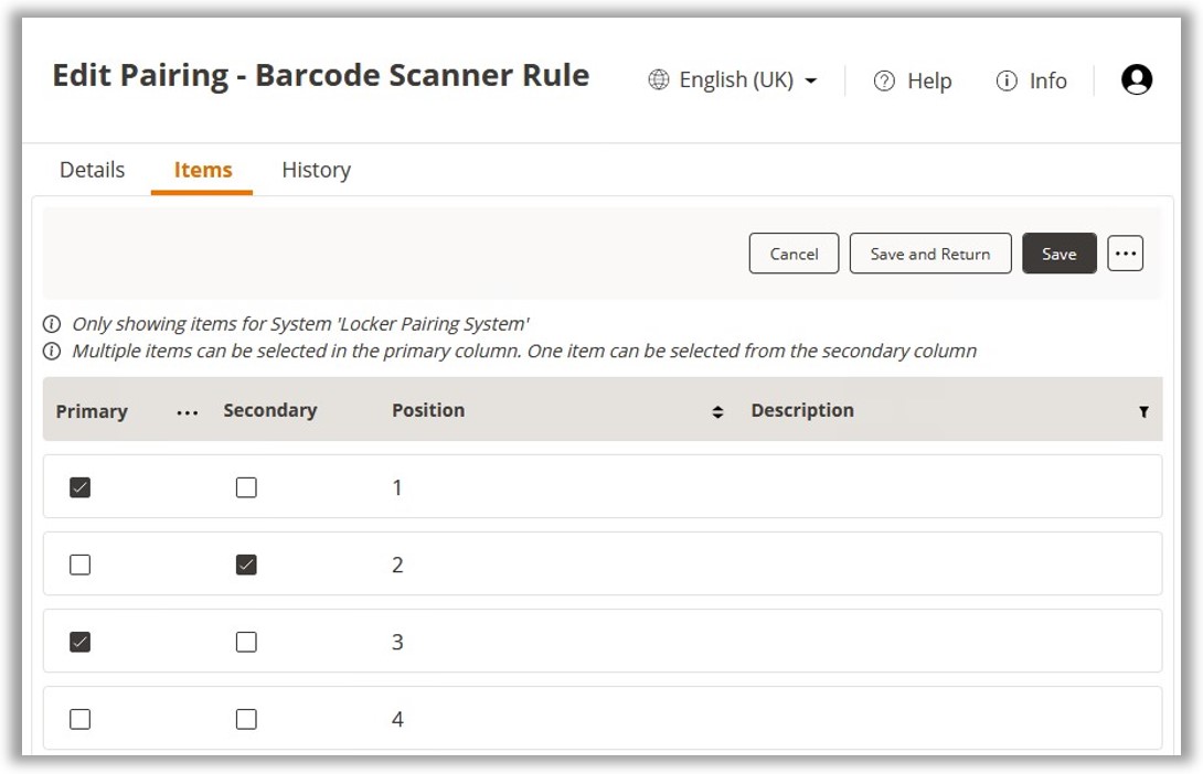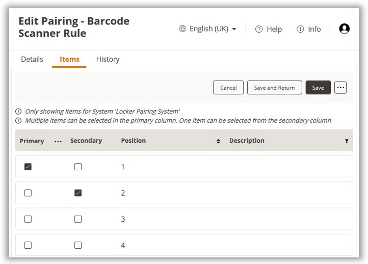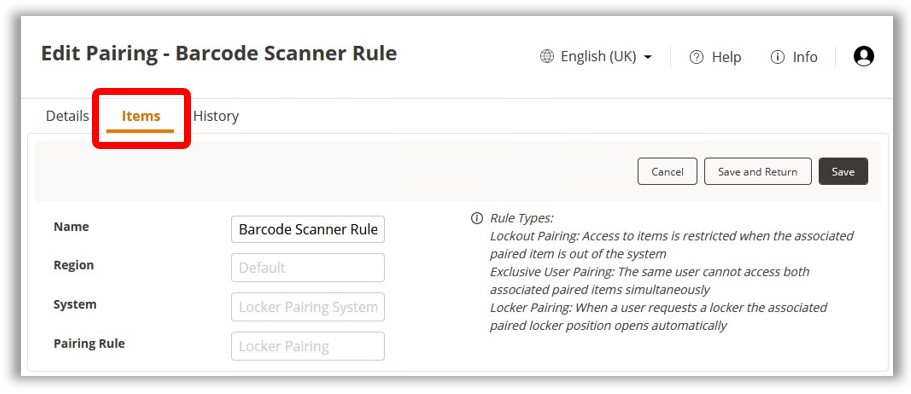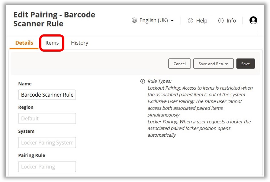 NOTE: If the “Allow any user to return items” option has been enabled with Locker Pairing, it is critical that during handover between users that both paired items are handed over and that the user returning the items has access to both paired locker compartments.