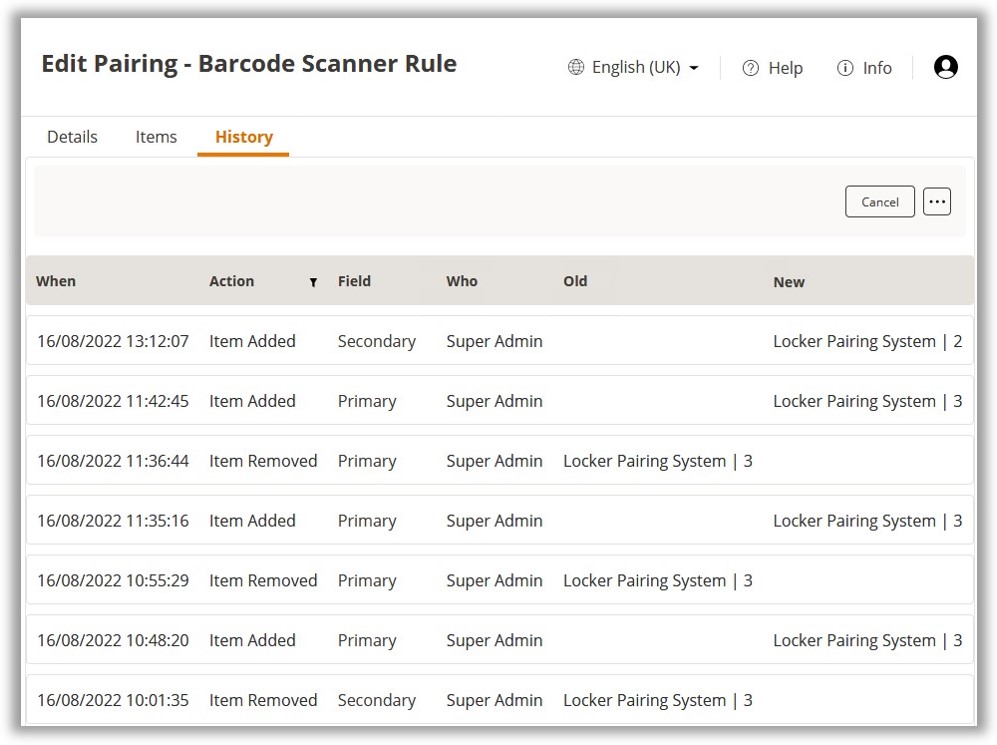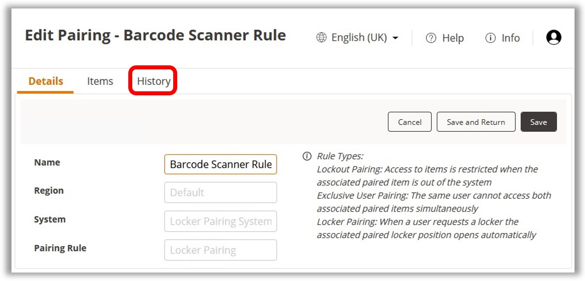 For the purposes of audit, all the changes in the Locker Pairing Rules are recorded in the History tab for each Item Pairing rule.