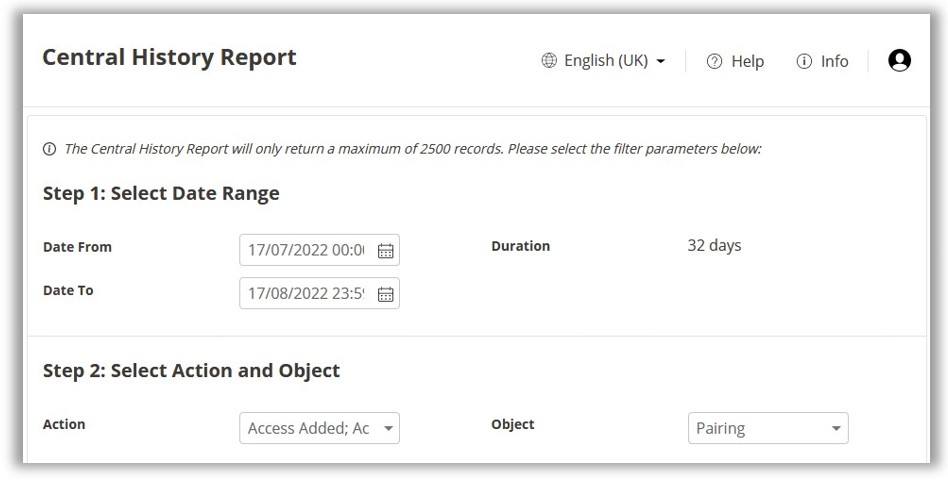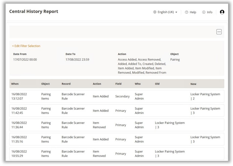 All the events related specifically to the Locker Pairing Rules will be visible in the Central History Report. You can also create a Central History Report and specifically choose Pairing as the Object for the report. To read more on how to generate such a report, please refer to the General Reports section in this document.